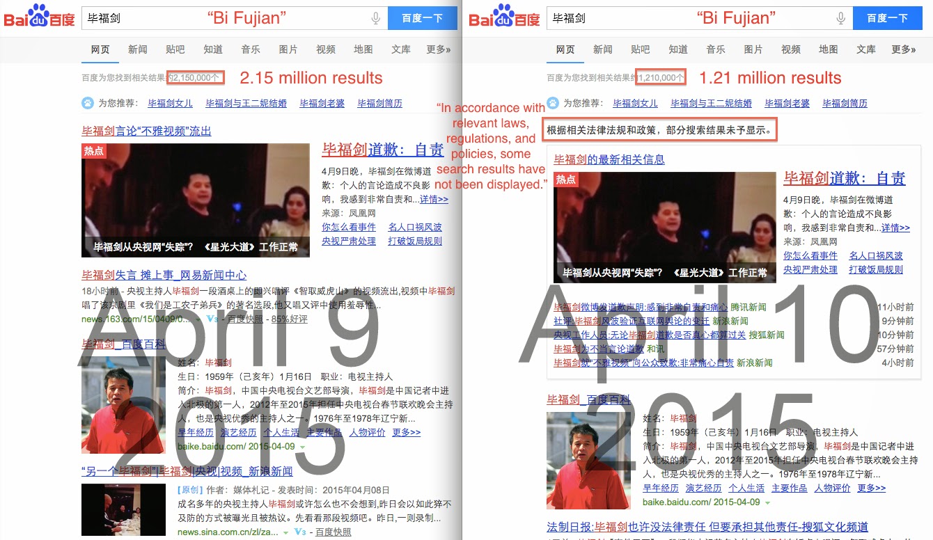 "Everyone should take responsibility for what he or she says in public and online. It's better, I think, to share different ideas in a normal way."These screenshots show that Baidu began censoring search results for “Bi Fujian” (毕福剑) on April 9/10.